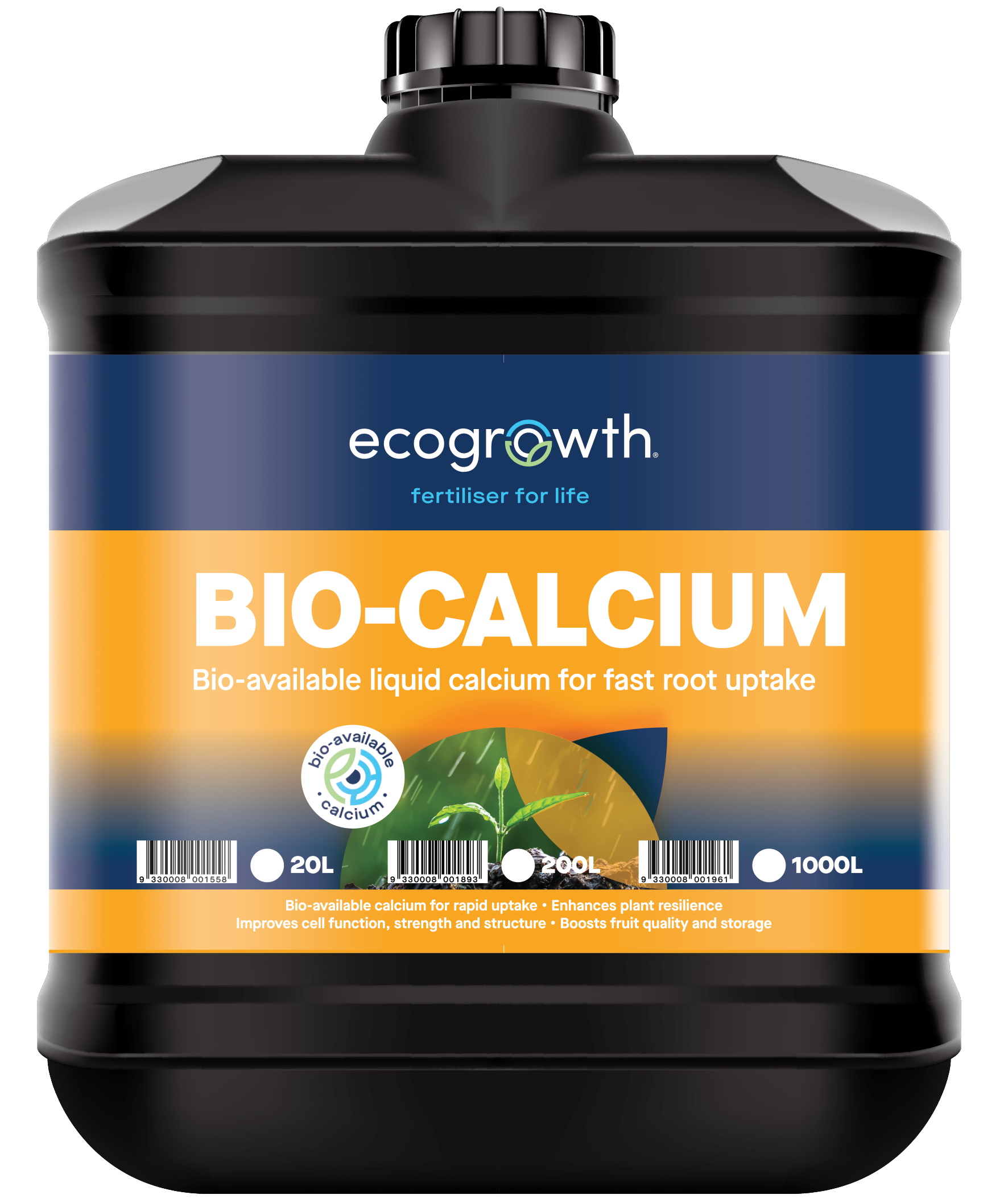 As a liquid soluble calcium source, Bio-Calcium is suited for both acidic and alkali soils, buffering hydrogen (pH) and displacing aluminium. Or in alkali soils, displacing sodium and buffering magnesium.