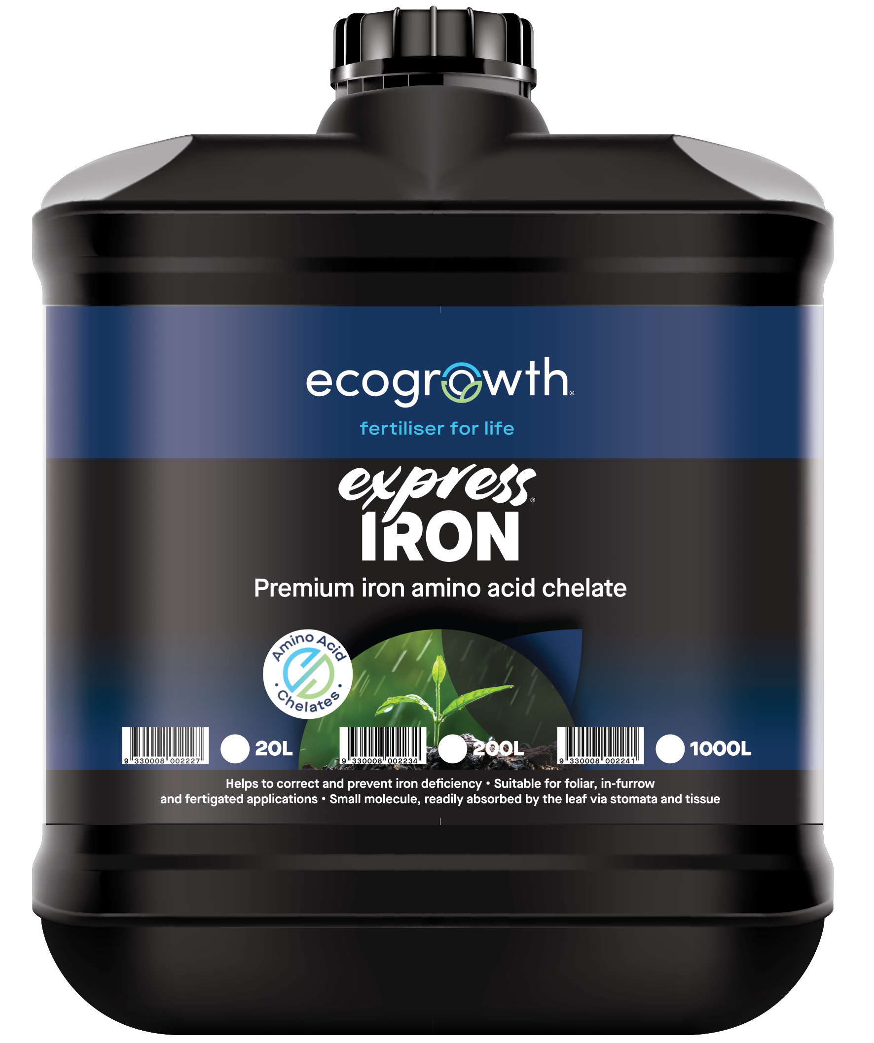 The most effective way to apply Express® IRON is via foliar application; however, it is suitable for in-furrow and fertigated applications as well as chelates, which minimise reactions in the soil solution, resulting in available nutrients for a longer period.