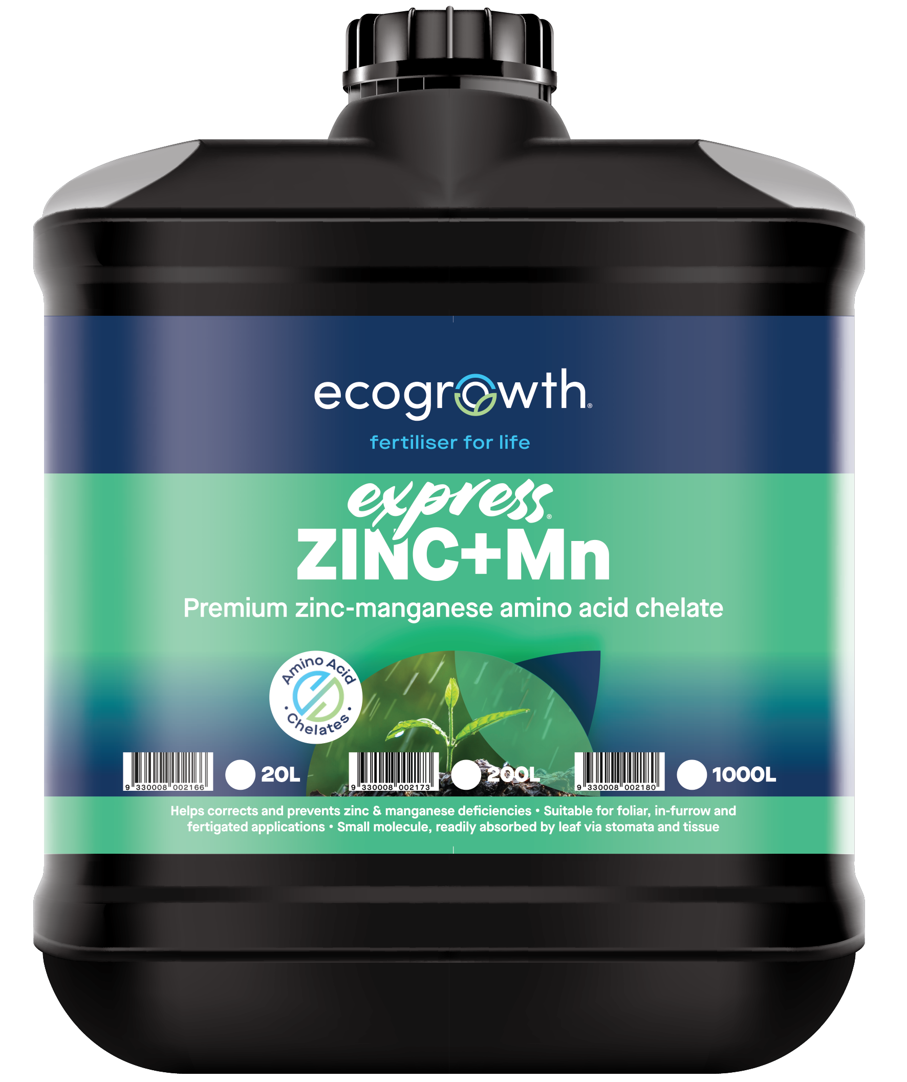 The most effective way to apply Express® ZINC+Mn is via foliar application; however, it is suitable for in-furrow and fertigated applications as well as chelates, which minimise reactions in the soil solution, resulting in available nutrients for a longer period.
